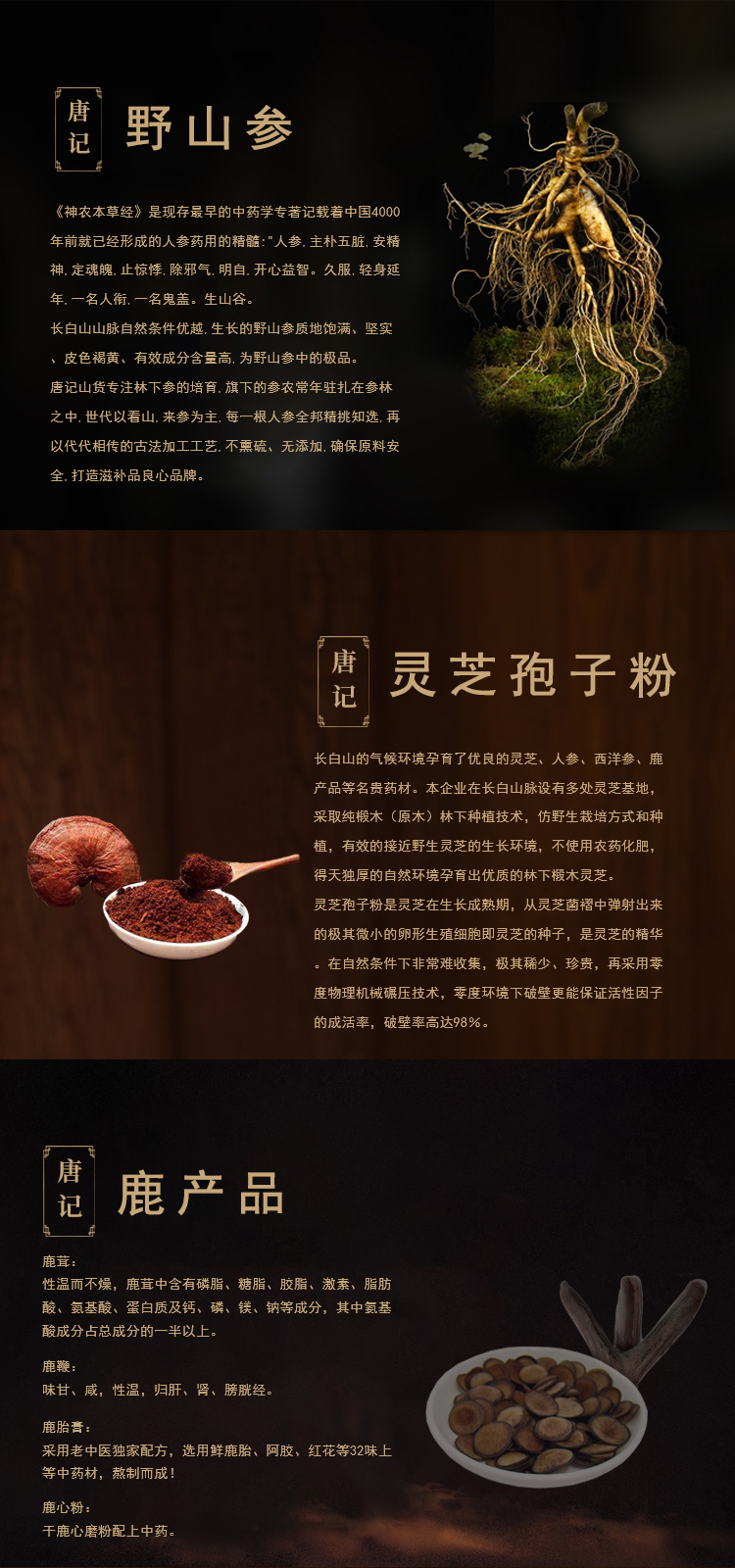 《神農(nóng)本草經(jīng)》是現(xiàn)存最早的中藥學(xué)專著記載著中國(guó)4000年前就已經(jīng)形成的人參藥用的精髓:"人參,主補(bǔ)五臟,安精神,定魂魄,止驚悸,除邪氣,明自,開心益智。久服,輕身延年,一名人銜,一名鬼蓋。生山谷。 長(zhǎng)白山山脈自然條件優(yōu)越,生長(zhǎng)的野山參質(zhì)地飽滿、堅(jiān)實(shí)、皮色褐黃、有效成分含量高,為野山參中的極品。